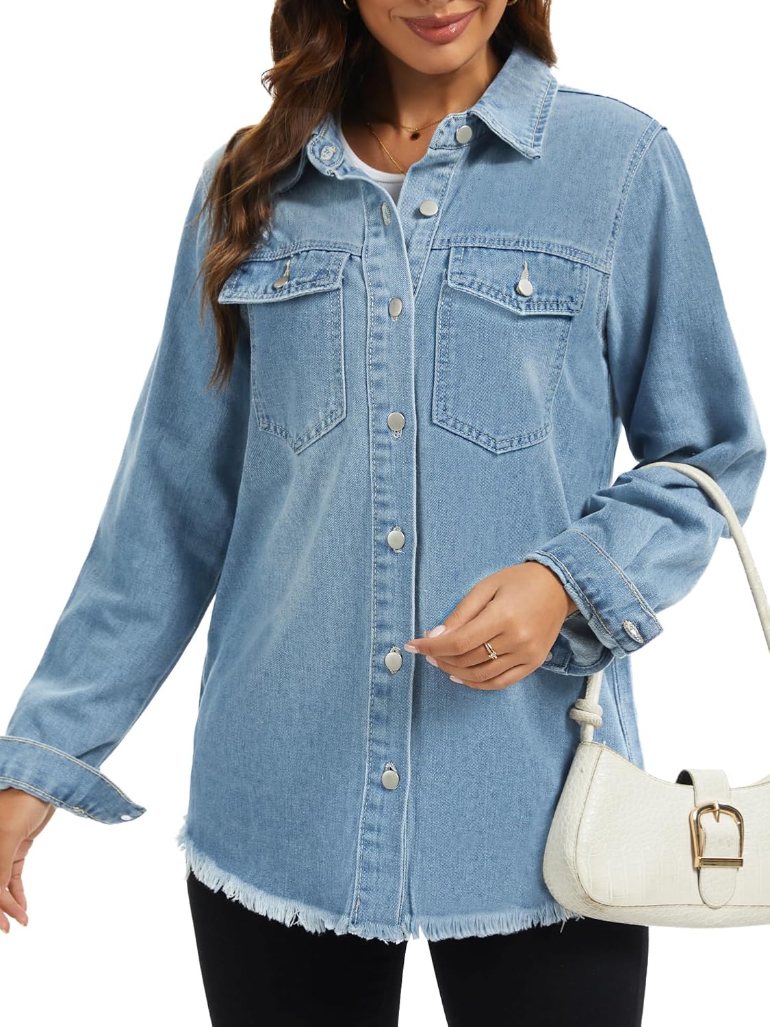 Oversized Frayed Hem Shacket Long Sleeve Pockets Denim Jean Jacket 2025 Fall