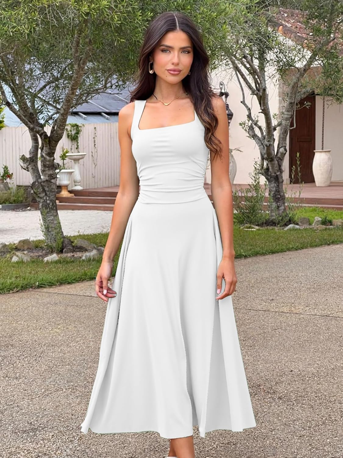 Kaximil Women’s Square Neck Corset A Line Maxi Dress Ruffle Ruched Waist Flowy Long Dresses